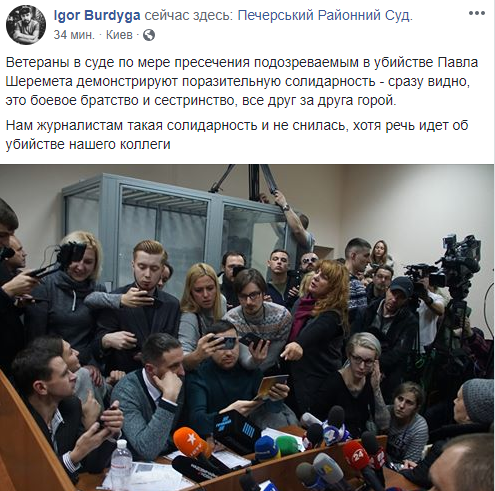 19:00 "Ветераны в суде по мере пресечения подозреваемым в убийстве Павла Шеремета демонстрируют поразительную солидарность - сразу видно, это боевое братство и сестринство, все друг за друга горой. Нам журналистам такая солидарность и не снилась, хотя речь идет об убийстве нашего коллеги" - написал журналист Игорь Бурдыга.