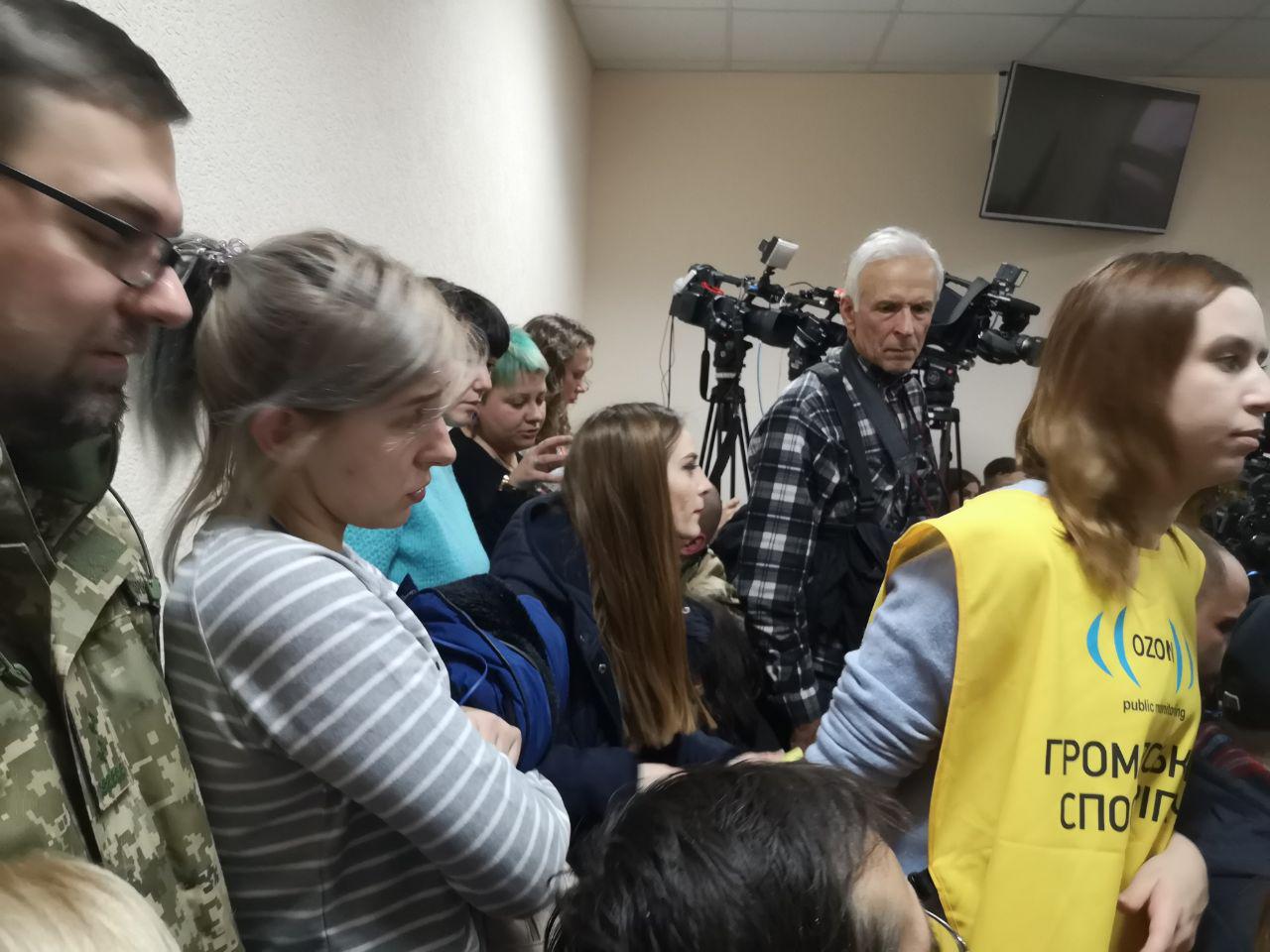 14:00 Все, кому не хватило места места в зале, находятся на улице. Среди них есть как журналисты, так и военные, которые, вероятно, пришли поддержать подозреваемых.