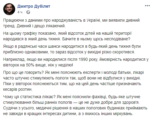 "Почему эта статистика пугает? Как мне объяснили специалисты, любое искусственное стимулирование более ранних родов - это не очень хорошо для здоровья", - написал Дубилет. При этом он предположив, что медицинские решения в роддомах принимают не всегда в интересах ребенка, а часто исходя из других соображений.