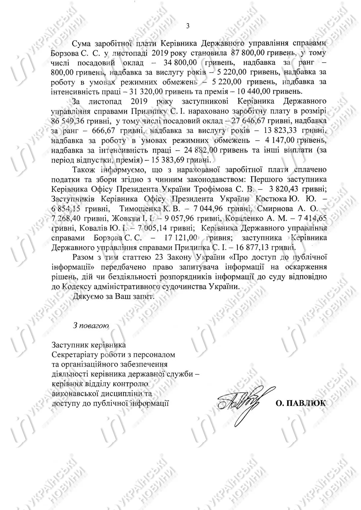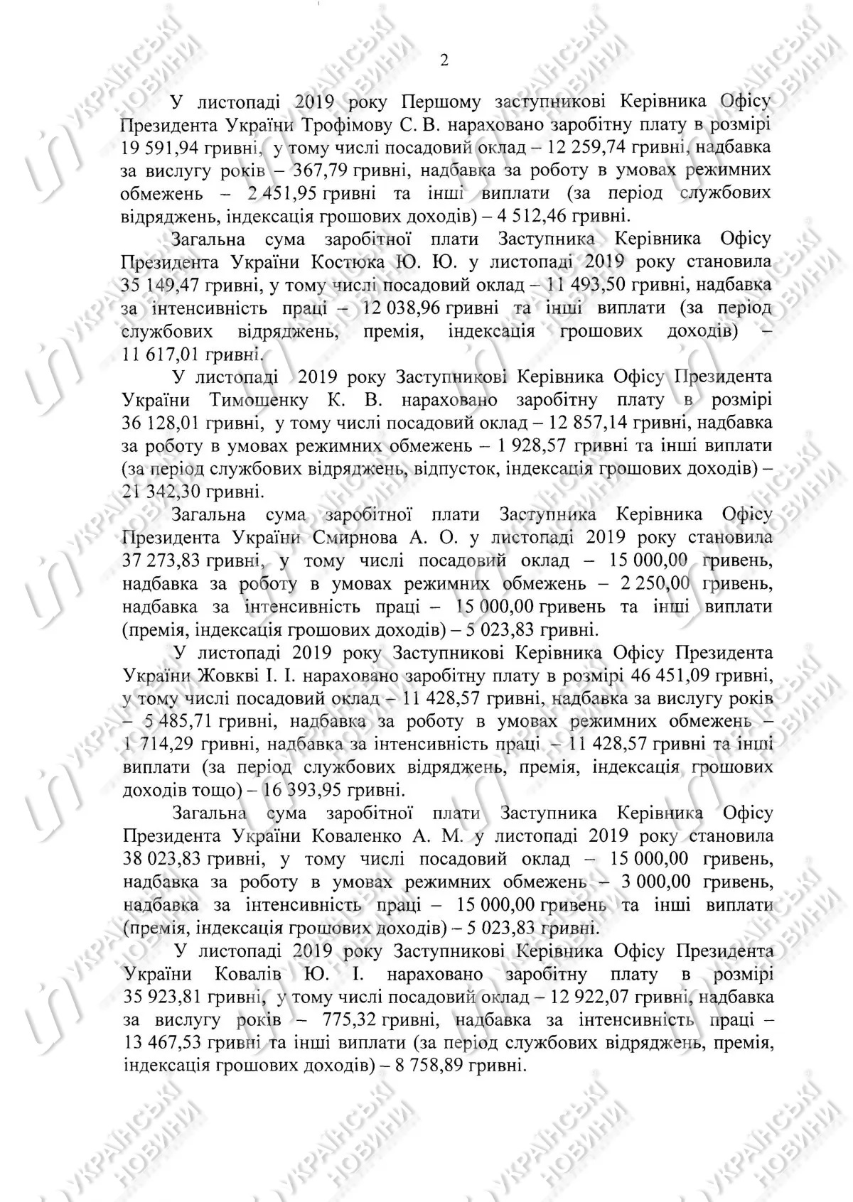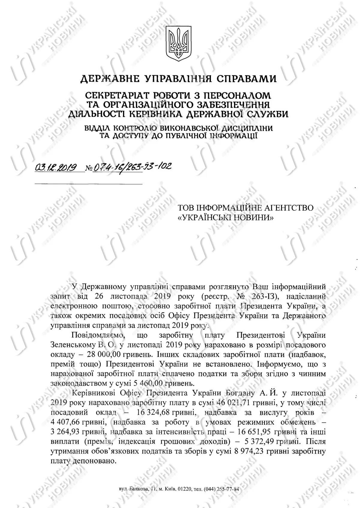 "Руководителю Офиса Президента Украины Богдану А. И. в ноябре 2019 года начислено заработную плату в сумме 46 022 гривны... После удержания обязательных налогов и сборов в сумме 8 974 гривны заработная плата депонирована", - сказано в ответе на запрос журналистов в Государственное управление делами.