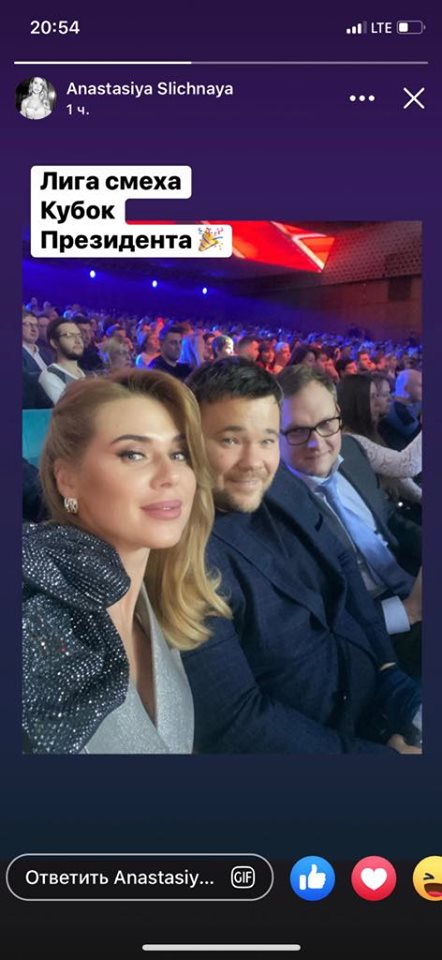 Глава Офиса президента Украины Владимира Зеленского Андрей Богдан пришел на "Президентский кубок" юмористической передачи "Лига смеха", который проходит сегодня, 13 декабря, в Киеве вместе со своей девушкой и заместителем. Это видно на фотографии, которую выложила в Instagram девушка Богдана Анастасия Сличная.