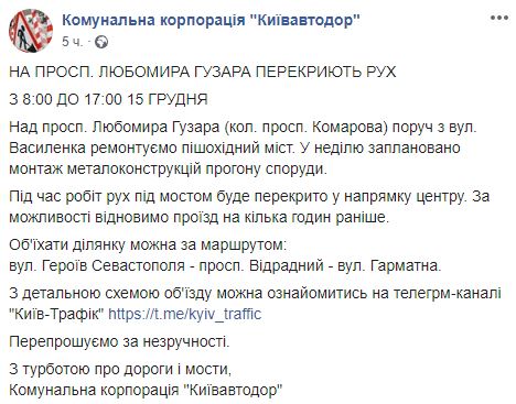 Завтра, 15 декабря, с 08:00 до 17:00 на проспекте Любомира Гузара перекроют движение по причине ремонта пешеходного моста. Об этом сообщает КП "Киевавтодор".