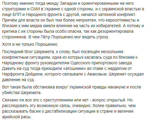 Последний блог Шеремета, к слову, был посвящен нескольким конфликтным ситуациям, одна из которых касалась суда по близким к "Народному фронту" руководителям Одесского припортового завода. Давить на суд тогда приходили "атошники" во главе с нардепом от "Нарфронта" Дейдеем, которого связывали с Аваковым. Шеремет осуждал давление на суд.