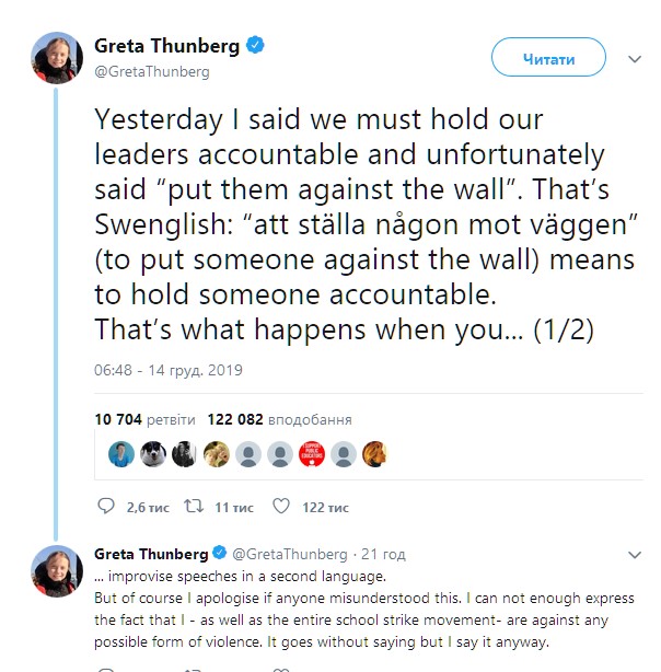 Позже Тунберг сделала заявление, в котором оправдала слова "поставить к стенке".