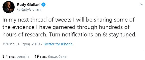 Сегодня, 15 декабря, Рудольф Джулиани, который вернулся в США после поездки в Киев, написал в своем Twitter, что следующая его публикация будет содержать "некоторые доказательства".