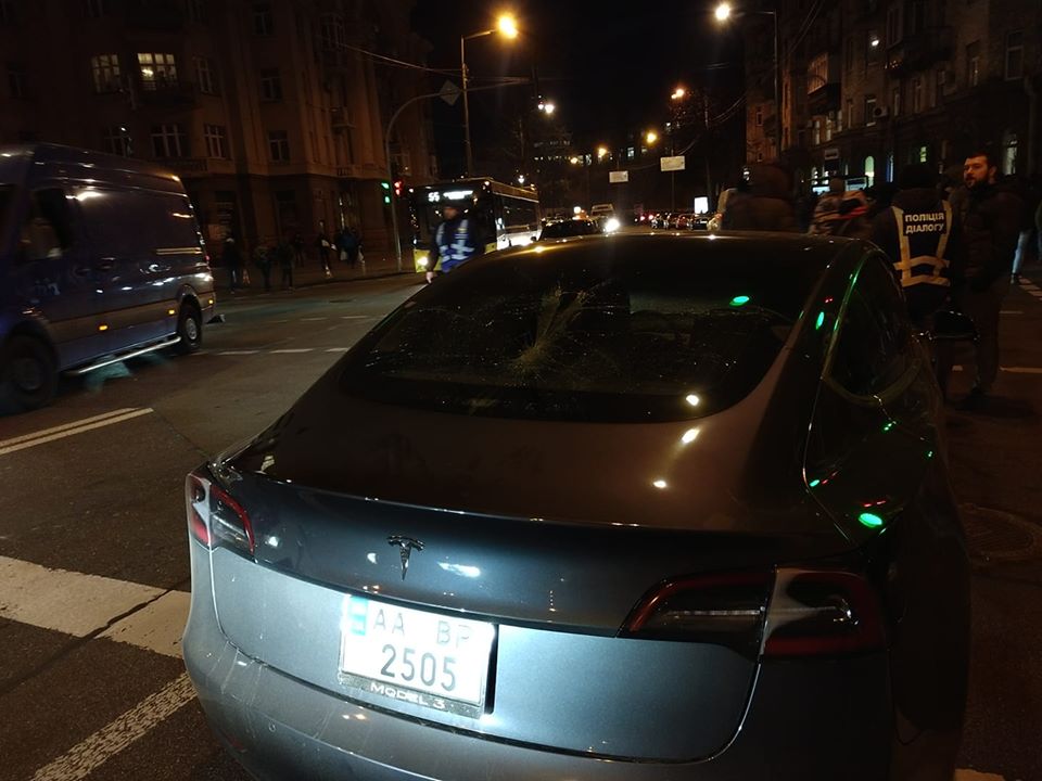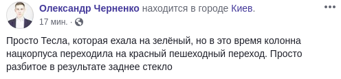 "Просто Тесла, которая ехала на зелёный, но в это время колонна Нацкорпуса переходила на красный пешеходный переход. Просто разбитое в результате заднее стекло" - написал пользователь.