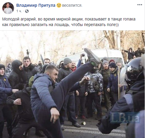 "Молодой аграрий, во время мирной акции, показывает в танце гопака как правильно залазить на лошадь, чтобы перепахать поле))" - придумал подпись Владимир Притула.