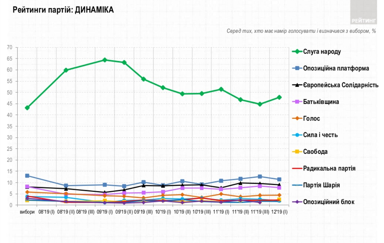 По состоянию на середину декабря лидером симпатий среди избирателей оказалась президентская партия "Слуга народа", которую поддерживают около 48% тех, кто уже определился и намерен принять участие в выборах.