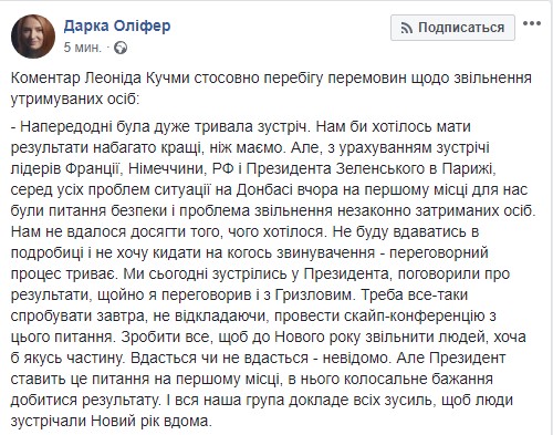 "Нам не удалось достичь того, чего хотелось. Не буду вдаваться в подробности и не хочу бросать на кого-то обвинение - переговорный процесс продолжается. Мы сегодня встретились у президента (президента Украины Владимира Зеленского – Ред.), поговорили о результатах, только что я переговорил и с Грызловым. Надо все-таки попробовать завтра, не откладывая, провести скайп-конференцию по этому вопросу. Сделать все, чтобы до Нового года освободить людей, хотя бы какую-то часть", - заявил Кучма.