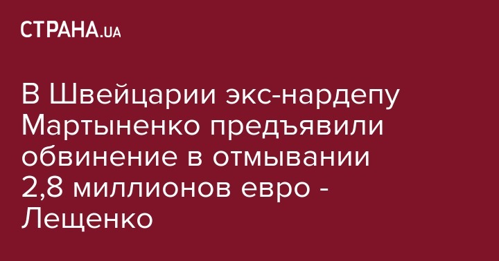 Официальное обвинение в отмывании 2,8 миллионов евро предъявлено экс-нардепу Николаю Мартыненко ("Народный фронт") в Швейцарии. Об этом на своей странице в соцсети написал бывший депутат Верховной Рады Сергей Лещенко.