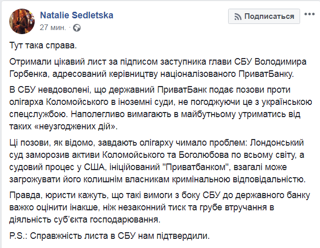 Послание СБУ подписано заместителем главы ведомства Владимиром Горбенко. В нем спецслужба возмущается тем, что государственный банк не согласовал иск с СБУ и потребовала в будущем воздержаться от таких "несогласованных действий".