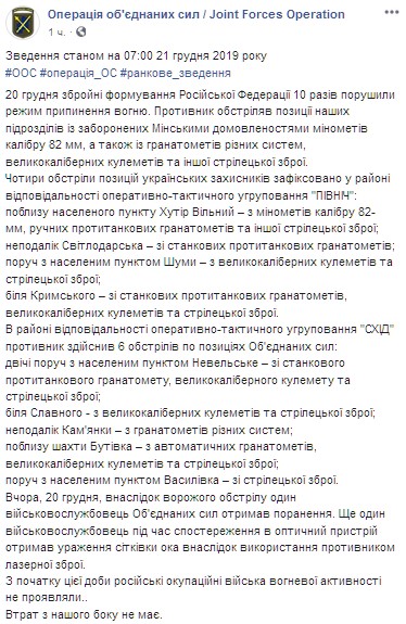 "20 декабря вооруженные формирования Российской Федерации 10 раз нарушили режим прекращения огня. Противник обстрелял позиции наших подразделений из запрещенных Минскими договоренностями минометов калибра 82 мм, а также из гранатометов различных систем, крупнокалиберных пулеметов и другого стрелкового оружия", - говорится в сообщении.