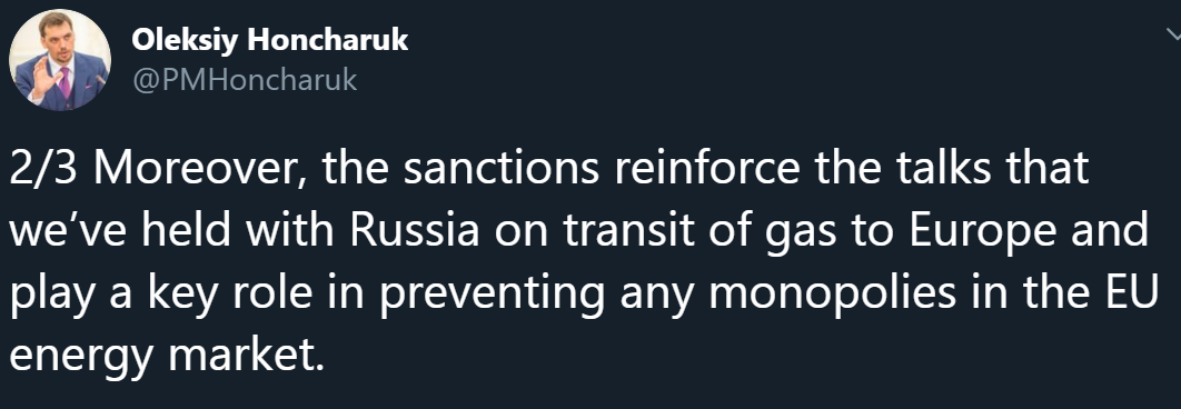"Санкции усиливают нашу позицию на переговорах с Россией о транзите газа в Европу", - написал в Твиттере премьер Алексей Гончарук.
