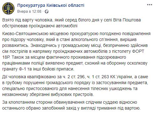 Сегодня, 21 декабря, в селе Вита-Почтовая (Киевская область) задержали мужчину, который обстреливал проезжающие военные автомобили среди бела дня. Об этом сообщается на странице областной прокуратуры в Facebook.
