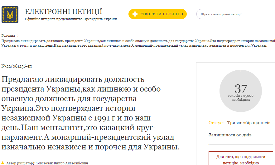 Автор петиции Виктор Товстоляк предложил ликвидировать должность президента Украины, "как лишнюю и особо опасную должность для государства Украина".