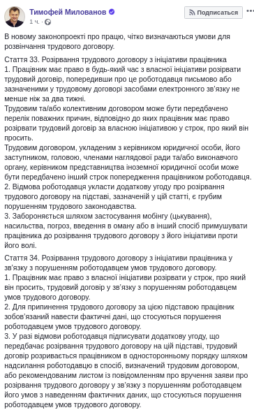 В указанном посте он предлагает проект четырех статей закона, в которых описаны нюансы разрыва трудового договора как по требованию сотрудника, так и по требованию работодателя. Однако, в первом же абзаце политик ошибся и написал "развенчание" вместо "разорвания".