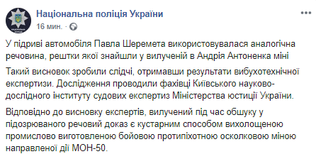 При подрыве автомобиля журналиста Павла Шеремета использовалось тоже вещество, остатки которого нашли у изъятой у Андрея Антоненко мины. Об этом сообщила пресс-служба Нацполиции в Facebook.