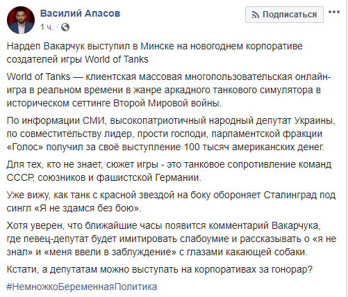 В сети отреагировали на новость о том, что нардеп и глава партии "Голос" Святослав Вакарчук на этих выходных выступил на новогоднем корпоративе в Минске у компании Wargaming, которая создала знаменитую игру "World of Tanks".