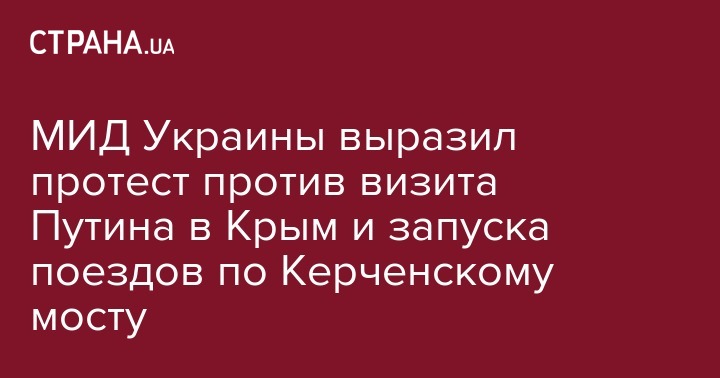 Министерство иностранных дел Украины заявило решительный протест в связи с несогласованным визитом президента РФ Владимира Путина на территорию Крыма и открытием движения по железнодорожной части моста через Керченский пролив. Заявление опубликовано сегодня на сайте ведомства.