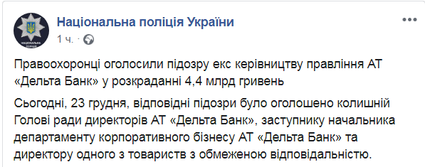 Генеральная прокуратура Украины объявила подозрение двум бывшим сотрудникам АО "Дельта Банк" и руководителю общества с ограниченной ответственностью по факту завладения средствами финучреждения в результате предварительного сговора. Об этом сообщается в Facebook Национальной полиции.