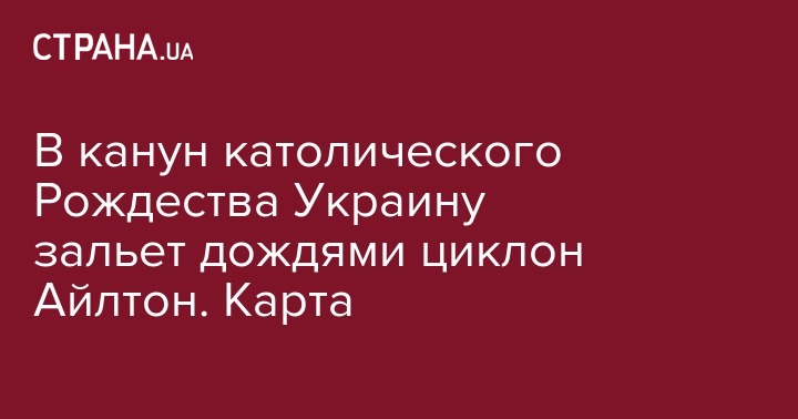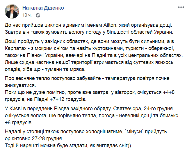 В Украину пришел циклон под названием Айлтон, из-за которого 24 декабря будет дождливо в большинстве областей. Об этом сообщает в Facebook синоптик Наталья Диденко.