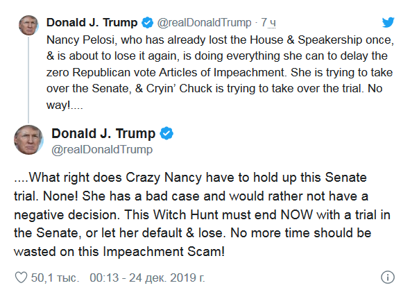 "Какое право сумасшедшая Нэнси имеет на то, чтобы затягивать процесс в Сенате? Никакого! У нее никудышные доказательства, и она стремится сделать так, чтобы результат не оказался для нее отрицательным. Охота на ведьм должна закончиться сейчас же процессом в Сенате. Больше не нужно тратить время на эту аферу с импичментом", - написал Дональд Трамп.