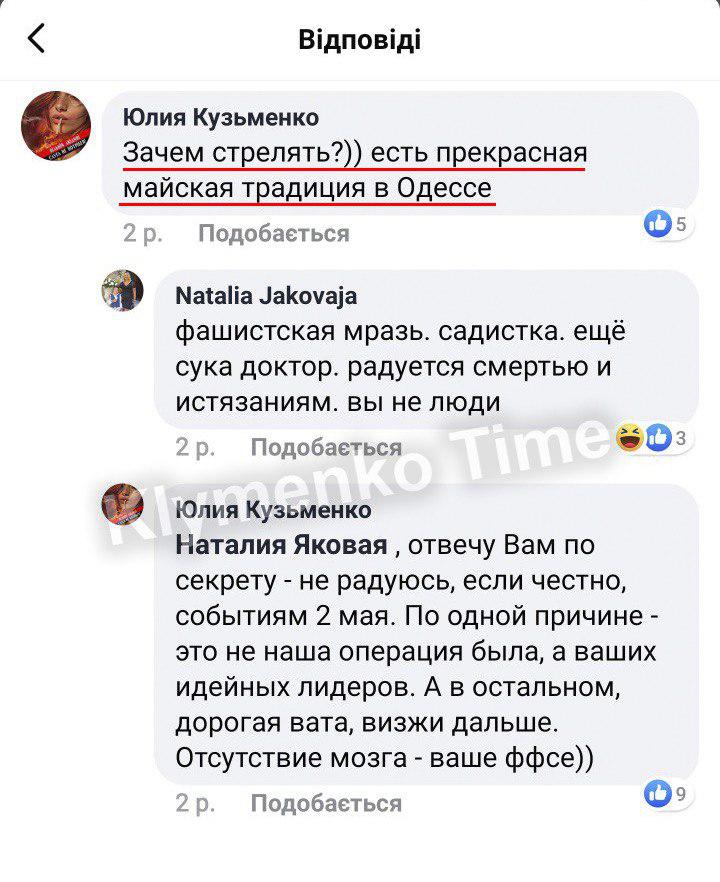 13:32  В Сети опубликовали комментарий Кузьменко в Facebook, где она поддерживает сожжение людей в Одессе 2 мая 2014 года.