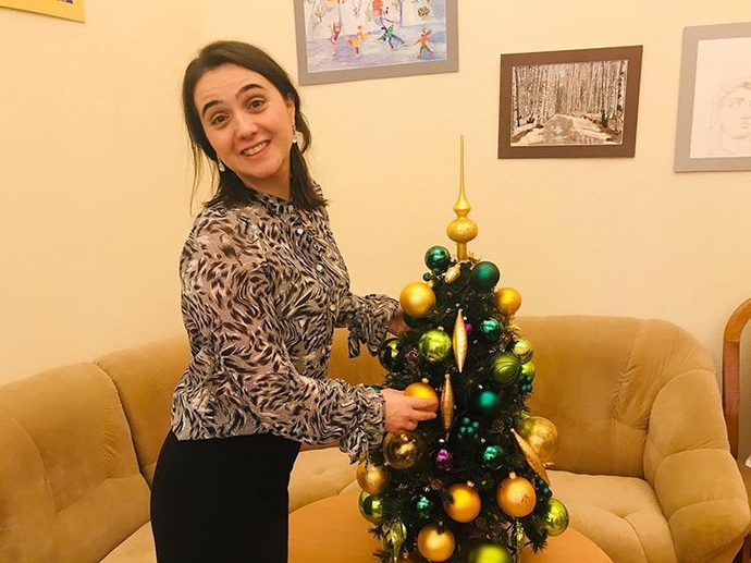 При этом, судя по фотографии, елок в Офисе президента две - большая и маленькая. На фото Мендель позирует с елкой в пестрой блузке.