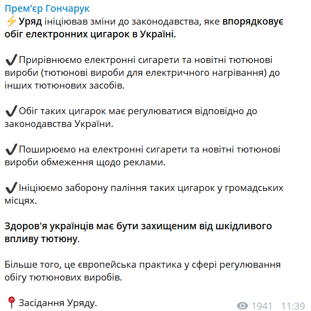 На заседании Кабинета министров Украины инициировали изменения в законодательство, которые упорядочивают обращение электронных сигарет в Украине, в частности приравнивает электронные сигареты и новейшие табачные изделия (табачные изделия для электрического нагрева) к другим табачным средствам. Об этом сообщается в телеграм-канале премьера Алексея Гончарука.