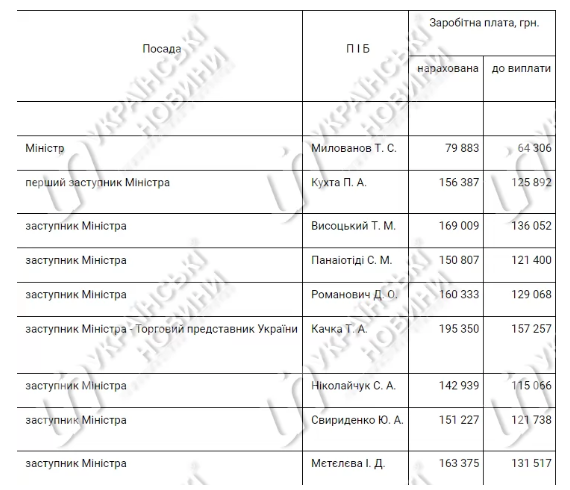 Зарплата первого заместителя министра Павла Кухты составила 156 387 гривен, заместителей Тараса Высоцкого – 169 009 гривен, Светланы Панаиотиди – 150 807 гривен, Дмитрия Романовича – 160 333 гривны, заместителя - торгового представителя Тараса Качки - 195 350 гривен, Сергея Николайчука – 142 939 гривен, Юлии Свириденко – 151 227 гривен, Инны Метелевой – 163 375 гривен.
