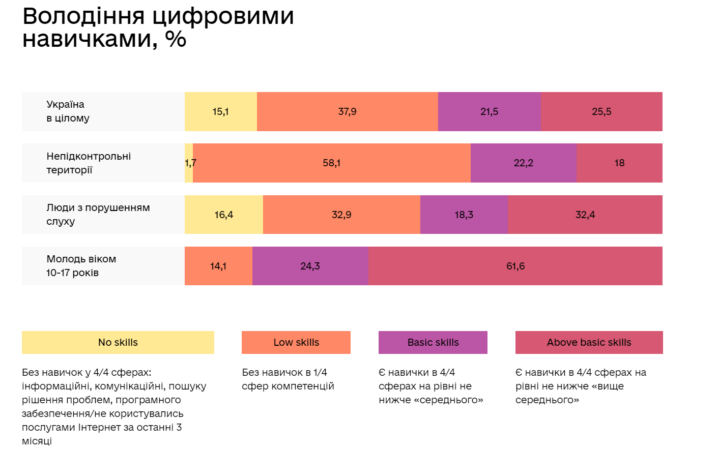 По итогу сообщается, что 37,9% украинцев в возрасте 18-70 лет имеют цифровые навыки ниже среднего. Еще 15,1% вообще не владеют ими. Таким образом 53% украинцев находится ниже отметки "средний уровень" по методологии оценки Европейской комиссии.