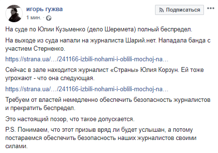 В свою очередь, главред "Страны" Игорь Гужва на своей странице в Facebook призвал власти "немедленно обеспечить безопасность журналистов и прекратить беспредел".