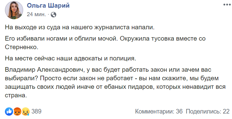 "На выходе из суда на нашего журналиста напали. Его избивали ногами и облили мочой. Окружила тусовка вместе со Стерненко. На месте сейчас наши адвокаты и полиция. Владимир Александрович, у вас будет работать закон или зачем вас выбирали?" - говорится на фб-странице заместителя главного редактора издания Ольги Шарий.