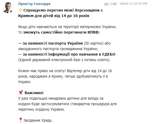 "Каждый имеет право на образование! Отныне дети от 14 до 16 лет, рожденные в Крыму, легче смогут получать его в Украине", - написал Гончарук.