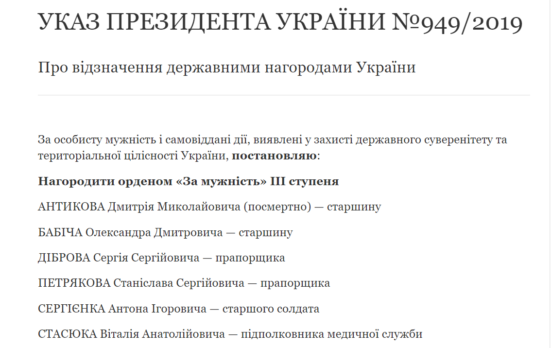 Пресс-служба президента Украины опубликовала указ о списке награжденных "За личное мужество" и самоотверженные действия, проявленные в защите государственного суверенитета и территориальной целостности Украины.