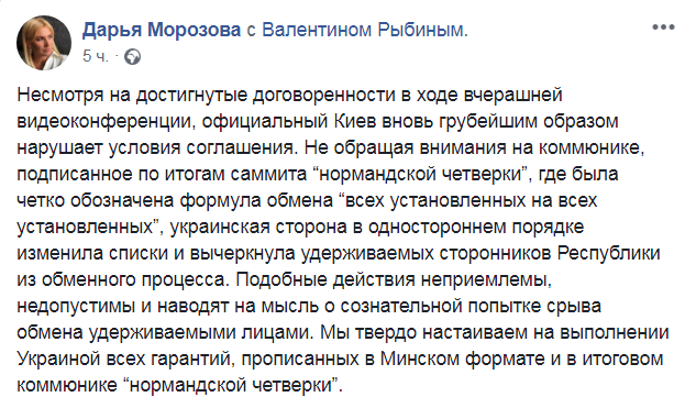 "Подобные действия неприемлемы, недопустимы и наводят на мысль о сознательной попытке срыва обмена удерживаемыми лицами. Мы твердо настаиваем на выполнении Украиной всех гарантий, прописанных в Минском формате и в итоговом коммюнике нормандской четверки", - написала омбудсмен.