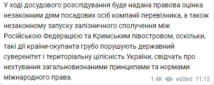 "В ходе досудебного расследования будет дана правовая оценка незаконным действиям должностных лиц компании перевозчика, а также незаконному запуску железнодорожного сообщения между Российской Федерацией и Крымским полуостровом, поскольку такие действия страны-оккупанта грубо нарушают государственный суверенитет и территориальную целостность Украины, свидетельствуют о пренебрежении общепризнанными принципами и нормами международного права", - говорится в сообщении прокуратуры.