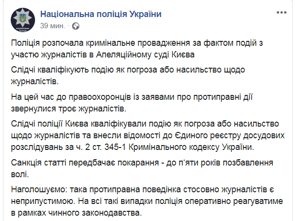"Следователи квалифицировали произошедшее как угрозу и насилия в отношении журналистов и внесли сведения в Единый реестр досудебных расследований по ч.2 ст.345-1 Уголовного кодекса Украины (умышленное причинение журналисту побоев, легких или средней тяжести телесных повреждений). Санкция которой предусматривает до пяти лет лишения свободы", - говорится в сообщении полиции.