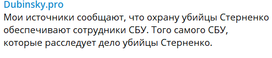 "Мои источники сообщают, что охрану убийцы Стерненко обеспечивают сотрудники СБУ. Того самого СБУ, которые расследует дело убийцы Стерненко", - написал в телеграм нардеп Александр Дубинский.