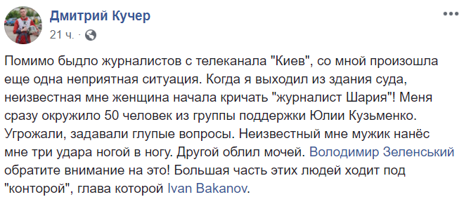 "Когда я выходил из здания суда, неизвестная мне женщина начала кричать "журналист Шария"! Меня сразу окружило 50 человек из группы поддержки Юлии Кузьменко. Угрожали, задавали глупые вопросы. Неизвестный мне мужик нанёс мне три удара ногой в ногу. Другой облил мочей. Володимир Зеленський обратите внимание на это! Большая часть этих людей ходит под "конторой", глава которой Ivan Bakanov", - описал ситуацию журналист.