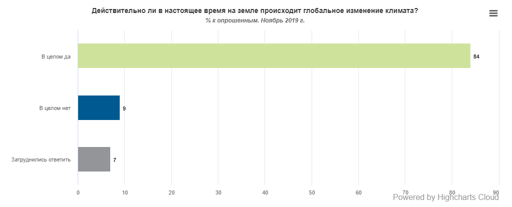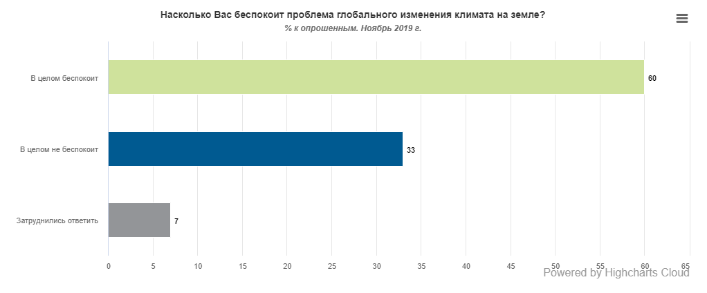 Как сообщается, количество тех, кто обеспокоен проблемой глобального изменения климата немного меньше: 60% жителей страны эта проблема беспокоит, тогда как 33% респондентов считают, что поводов для беспокойства нет.