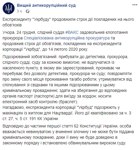 "Подозреваемый обязан: прибывать к детективу, прокурору, следователю, судье суда по каждому требованию; не отлучаться из населенного пункта, в котором он зарегистрирован, проживает или находится без разрешения детектива, прокурора или суда; сообщать об изменении своего места жительства или работы; воздерживаться от общения со свидетелями и другими подозреваемыми в этом уголовном производстве; сдать на хранение в соответствующие органы паспорт (паспорта) для выезда за границу; носить электронное средство контроля (браслет)", - говорится в сообщении, на официальной странице ВАКС в соцсети Фейсбук в среду вечером.