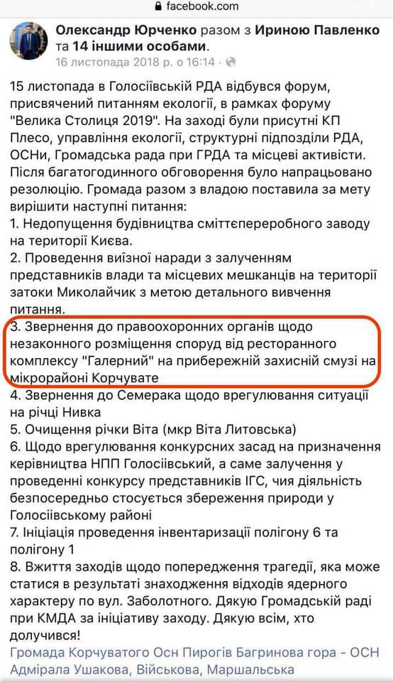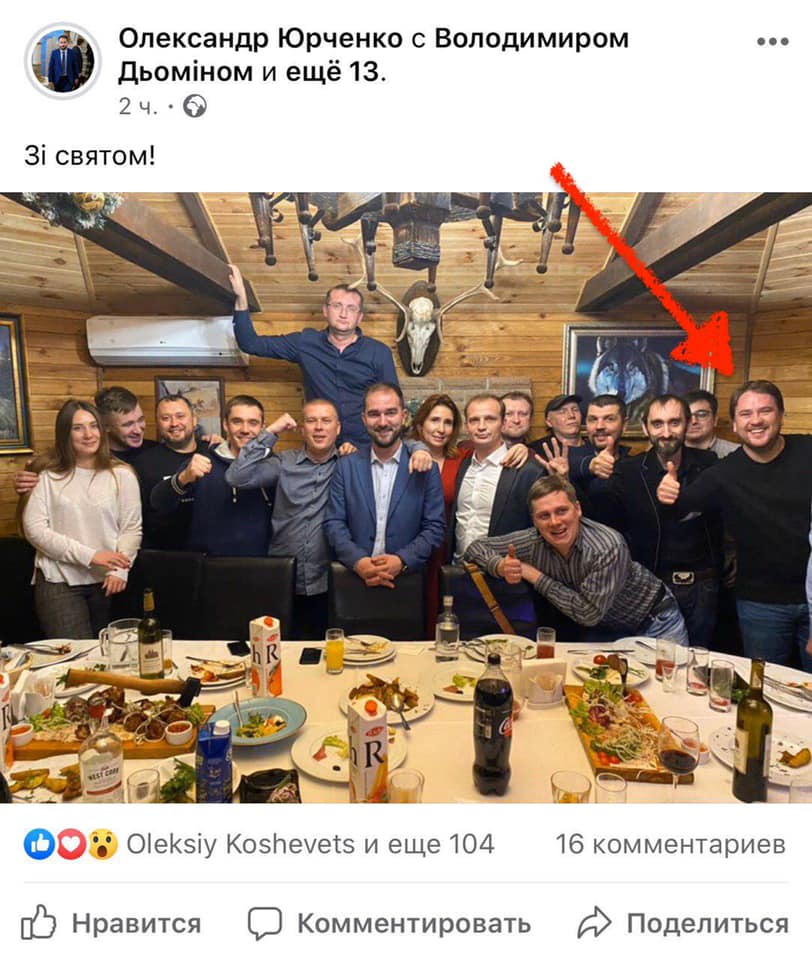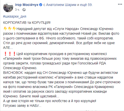 "Этот корпоративчик проходил в ресторанном комплексе "Галерный", который чуть больше года назад требовал от правоохранительных органов закрыть председатель общественного совета при Голосеевской РГА Александр Юрченко. ВЫВОД: нардеп от СН Александр Юрченко еще будучи активистом нагибав ресторанный комплекс "Галерный", а уже став нардепом нагнул так, что теперь бухает там вместе с помощниками! Кстати стрелочкой на фото замечено владельца РК "Галерный" Александра Крамаренко который и оплатил за счет своего заведения корпоративчик команды Юрченко", - написал Мосийчук и добавил, что готовится заявление в НАБУ.
