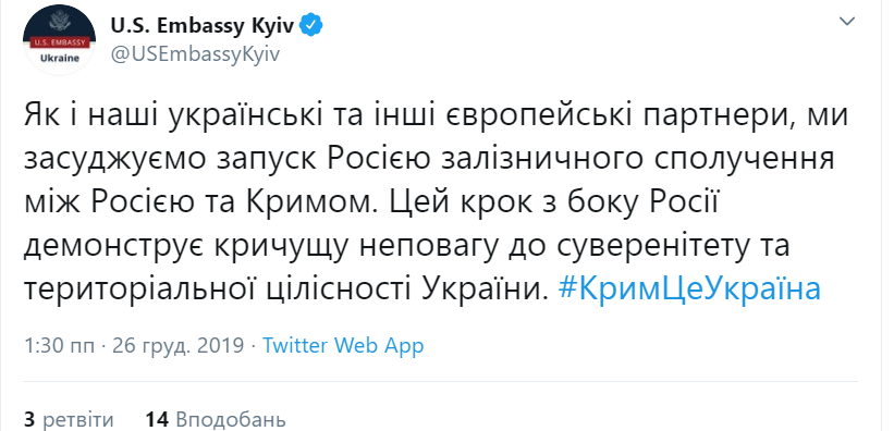 "Как и наши украинские и другие европейские партнеры, мы осуждаем запуск Россией железнодорожного сообщения между Россией и Крымом. Этот шаг со стороны России демонстрирует вопиющее неуважение к суверенитету и территориальной целостности Украины", - говорится в опубликованном сообщении.