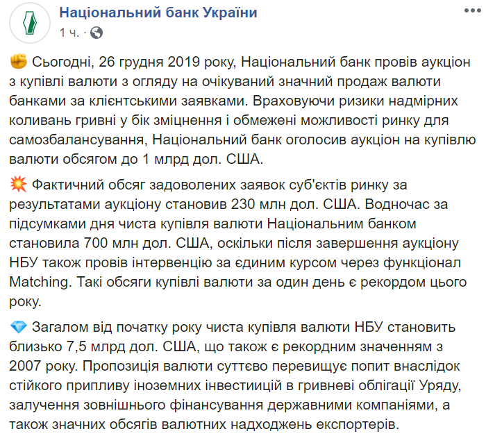 Согласно сообщению, в целом с начала 2019 года чистая покупка валюты НБУ составляет около $7,5 млрд, что также является рекордным значением с 2007 года.