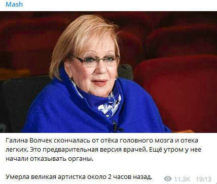 "Галина Волчек скончалась от отека головного мозга и отека легких. Это предварительная версия врачей. Еще утром у нее начали отказывать органы", - сообщил Telegram-канал Mash.