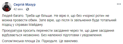 14:25 Погромщик с Лысой горы Мазур в Facebook призывает прийти на суд по экс-беркутовцам, потому что "после их освобождения будет тотальный п@ц в делах Майдана".