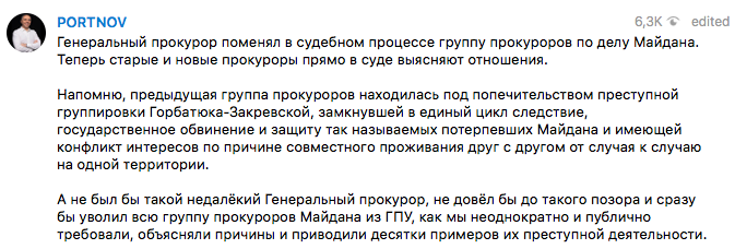 А не был бы такой недалёкий Генеральный прокурор, не довёл бы до такого позора и сразу бы уволил всю группу прокуроров Майдана из ГПУ, как мы неоднократно и публично требовали, объясняли причины и приводили десятки примеров их преступной деятельности", - написал Портнов в телеграме.