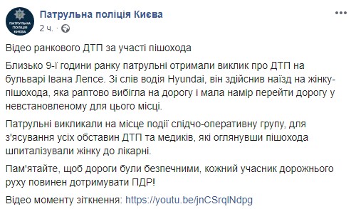 В пятницу, 27 декабря, в Киеве около остановки трамвая произошло ДТП, в результате которого автомобиль Hyundai сбил женщину, перебегавшую дорогу. Об этом сообщает Патрульная полиция Киева.