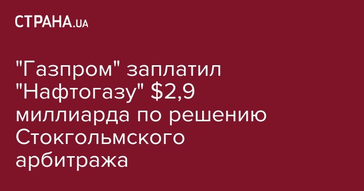 ПАО "Газпром" заплатило НАК "Нафтогаз Украины" $2,9 млрд, присужденных Стокгольмским арбитражем по спору о контракте на транзит.